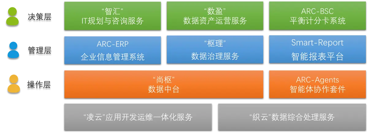 在決策層,“智匯”IT規(guī)劃與咨詢服務,憑借專業(yè)團隊對行業(yè)趨勢和技術生態(tài)的深度洞察,為企業(yè)量身定制契合發(fā)展戰(zhàn)略的IT架構藍圖,明晰數(shù)字化路徑;“數(shù)盈”數(shù)據(jù)資產(chǎn)運營服務,挖掘企業(yè)數(shù)據(jù)價值,將分散數(shù)據(jù)轉(zhuǎn)化為可運營、能創(chuàng)造效益的資產(chǎn),驅(qū)動業(yè)務創(chuàng)新;ARC - BSC平衡計分卡系統(tǒng),以戰(zhàn)略為導向,從財務、客戶、內(nèi)部流程、學習與成長等維度,量化指標、監(jiān)控進度,助力科學決策 。