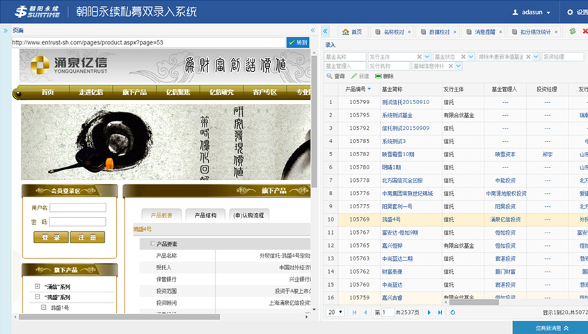 朝陽永續(xù)私募雙錄入項目是重構(gòu)項目,主要用來實現(xiàn)基于金融報告等的數(shù)據(jù)的錄入、校對。系統(tǒng)實現(xiàn)了管理員對錄入和校對人員進(jìn)行授權(quán)并對錄入人員進(jìn)行分組,錄入人員1和錄入人員2使用平臺錄入數(shù)據(jù),校對人員進(jìn)行校對、扣分、一致提交入庫等操作。系統(tǒng)通過雙錄入和校對機(jī)制從而減少了數(shù)據(jù)錄入的錯誤率,提高了數(shù)據(jù)準(zhǔn)確性。